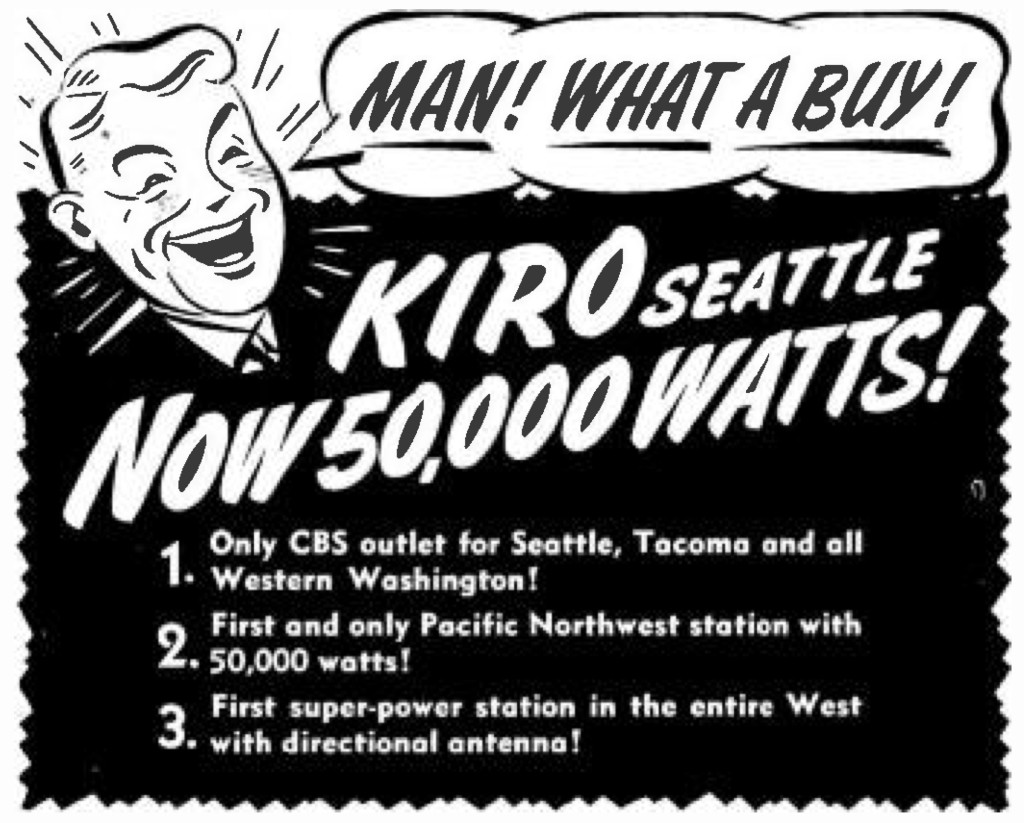With the new transmitter and boosted signal, KIRO’s local news and other programs could now be heard far beyond Puget Sound, and well into British Columbia, Oregon, Northern California and even Alaska. For many listeners in Alaska, KIRO would be the first station to provide regular radio service.