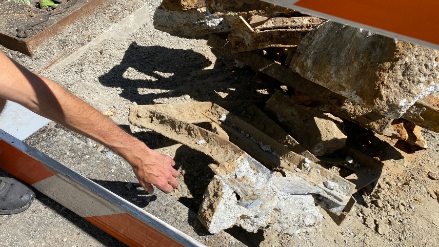 “I was doing some work at the foot of Madison,” Finelli told KIRO Newsradio Tuesday afternoon, as he stood near where contractors are working on the BRT, replacing long stretches of roadway with new lengths of reinforced concrete to accommodate buses. “And as I was driving up Madison, my eyes wandered and I saw probably 70 [railroad] ties. And then I thought, ‘I gotta get out and have a closer look.’