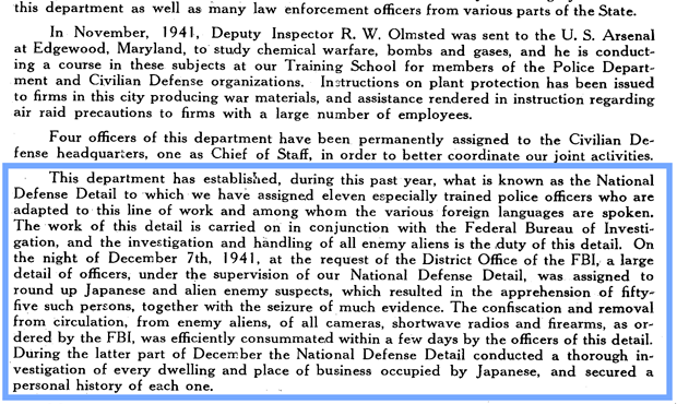 “On the night of Dec. 7, 1941, at the request of the District Office of the FBI, a large detail of officers under the supervision of our National Defense Detail was assigned to round up Japanese and alien enemy suspects, which resulted in the apprehension of fifty-five such persons together with the seizure of much evidence.”