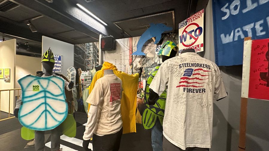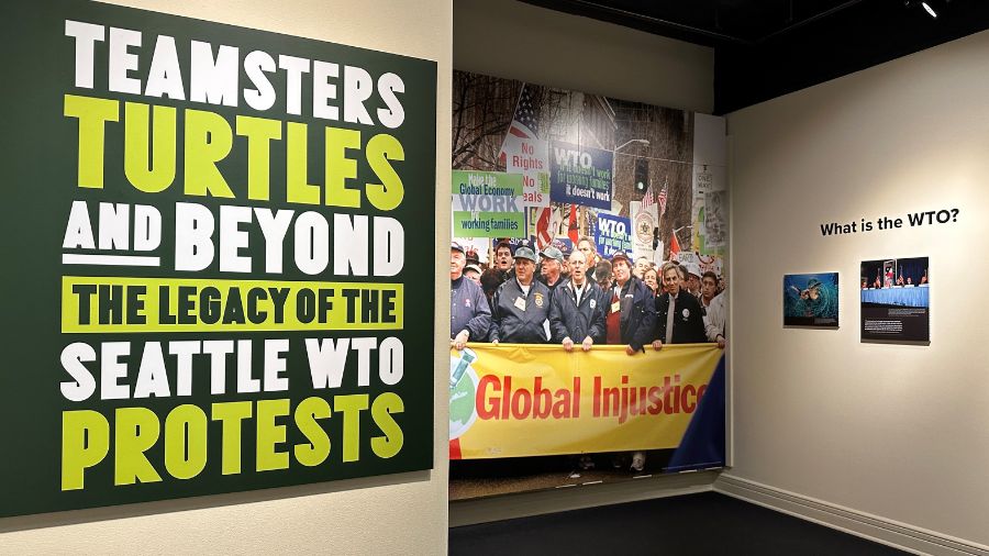 A quarter-century after it happened, a new exhibit at the Museum of History & Industry (MOHAI) in Seattle is a reminder of what the WTO was about, and how it made its infamous mark on local and world history. The exhibit, “Teamsters, Turtles, and Beyond: The Legacy of the Seattle WTO Protests,” opened Friday, and will be on display in the museum at Lake Union Park through the end of April 2025.