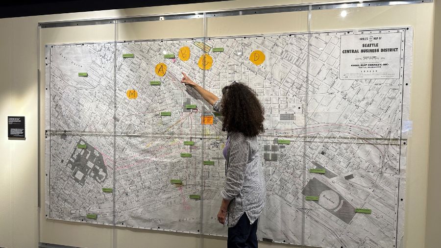 Woodward told KIRO Newsradio that someone from DAN took a Kroll map of downtown Seattle and enlarged it, and then had it printed out on giant paper, creating a map roughly six-feet high 12-feet across. At the MOHAI exhibit, the vintage map is displayed behind Plexiglas, so visitors can walk right up to it and see the original markings, and see how MOHAI has annotated it with additional context and history.